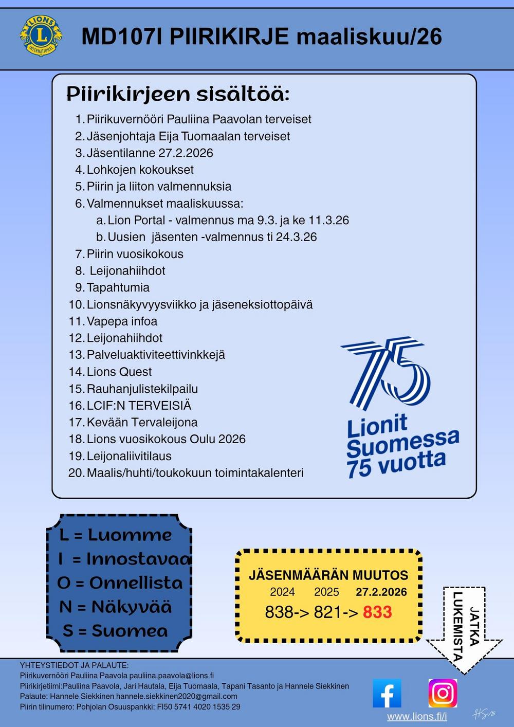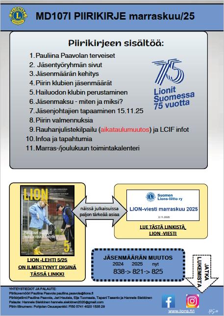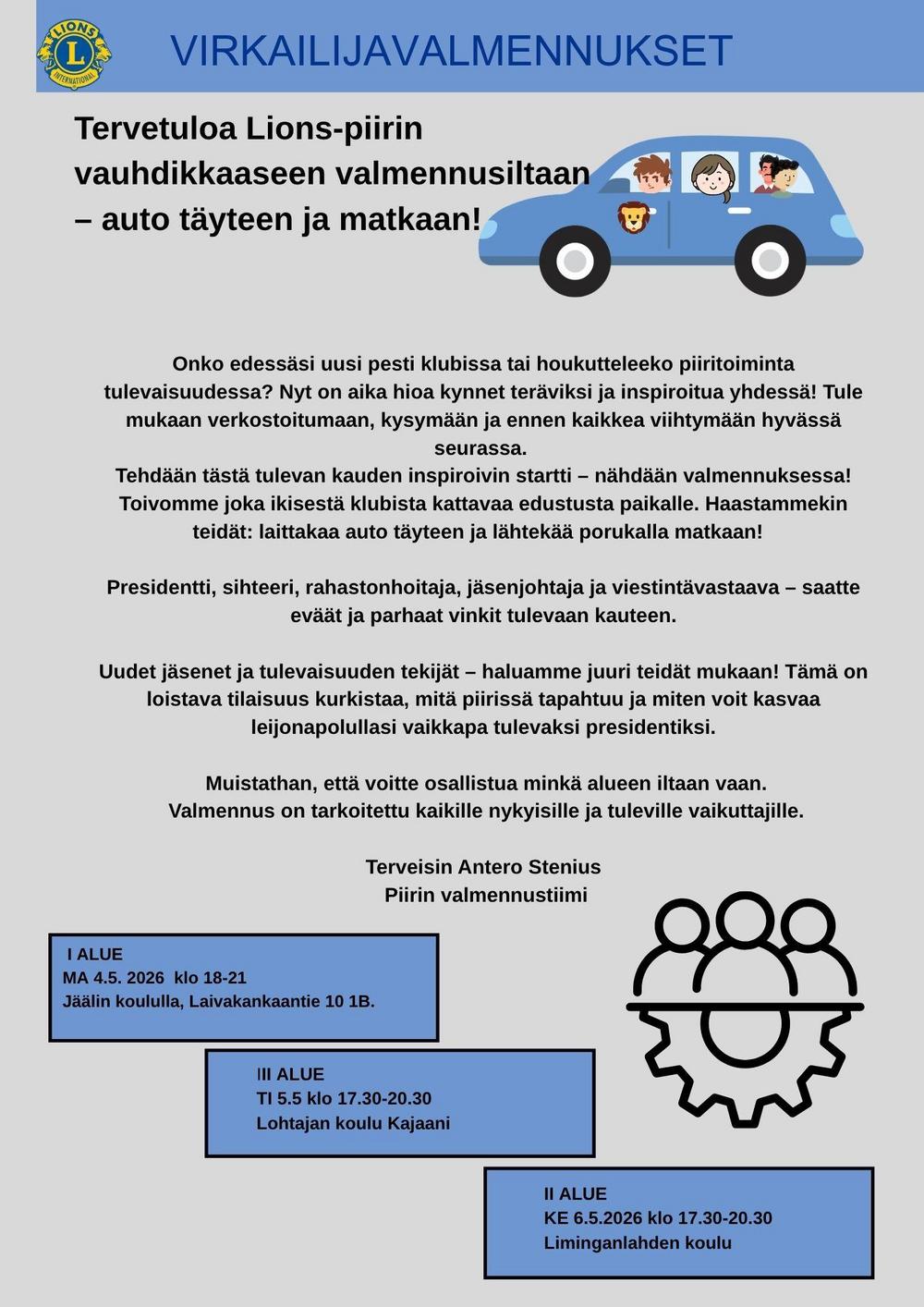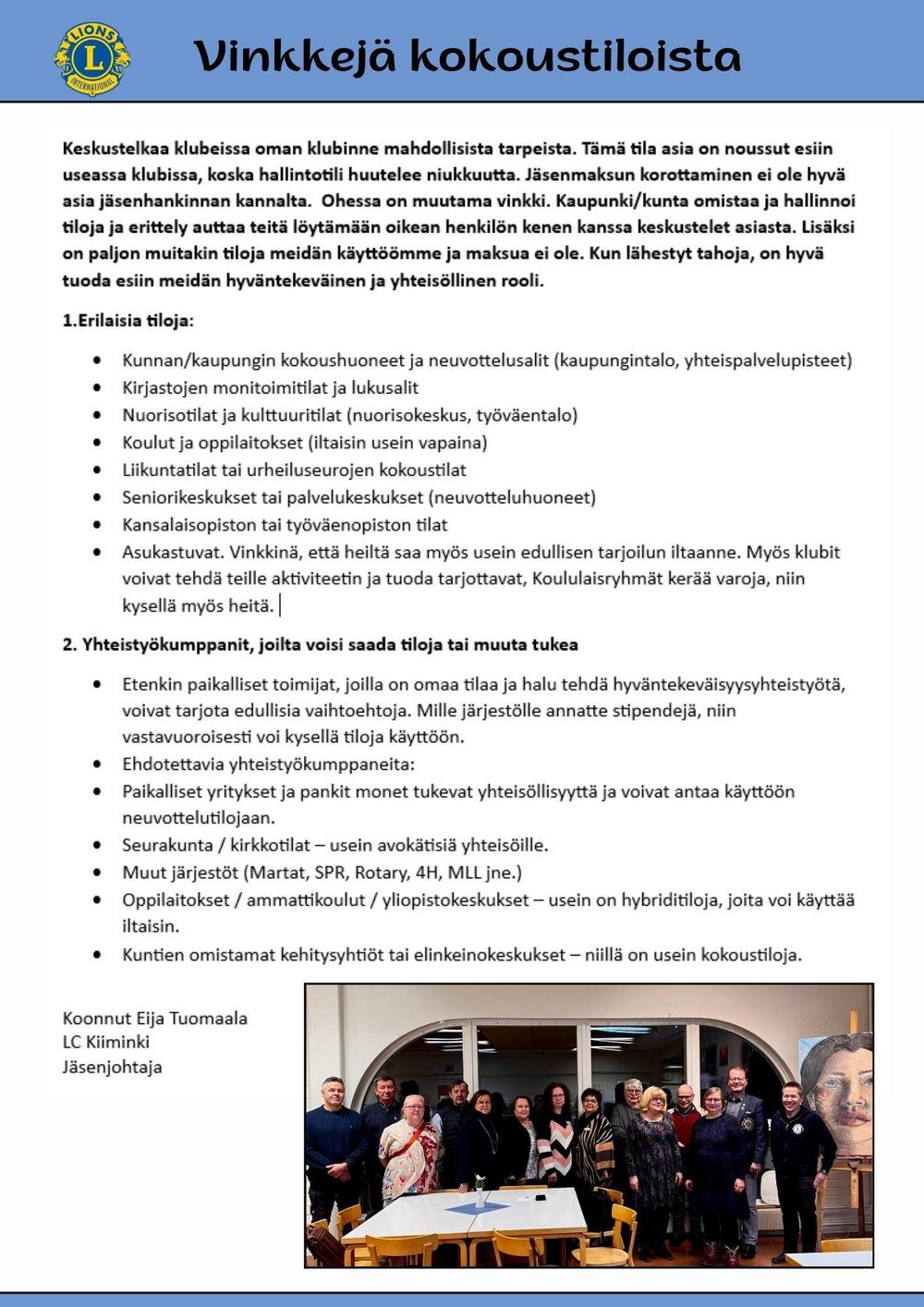 Piirin jäsenjohtaja Eija Tuomaala auttaa sinua sopivan klubin löytämisessä ja kertoo Lions-toiminnasta. eija.tuomaala(at)lions.fi tai GSM 040 8678 152