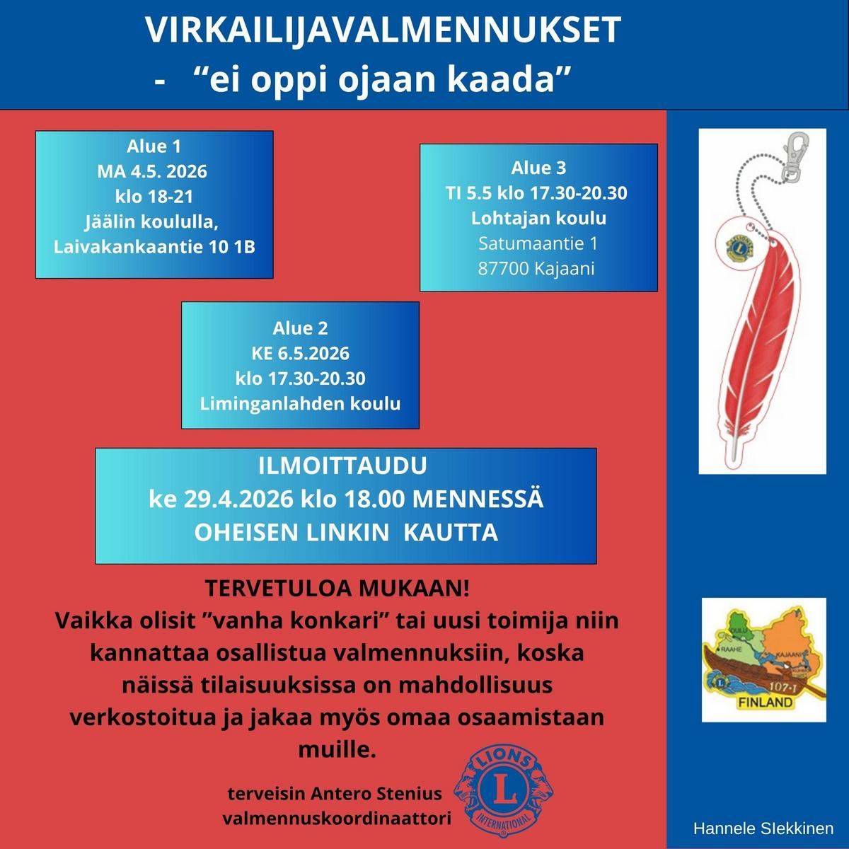 ILMOITTAUDU ke 29.4.2026 klo 18.00 mennessä! Ohjelmat tarkentuvat myöhemmin. I ALUE (vastuuhenkilö x) MA 4.5. 2026 klo 17.30-21 Jäälin koululla, Laivakankaantie 10 1B ILMOITTAUTUMISLINKKI II ALUE…