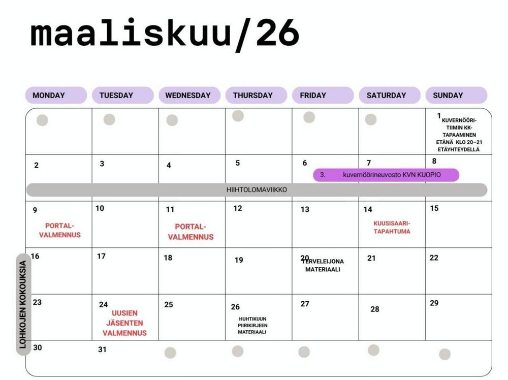 Tarkemmat valmennuksien sisällöt, ajankohta, paikka/etäyhteys ja ilmoittautuminen julkaistaan noin 3-4 viikkoa ennen tilaisuuksia. Seuraa ilmoittelua!