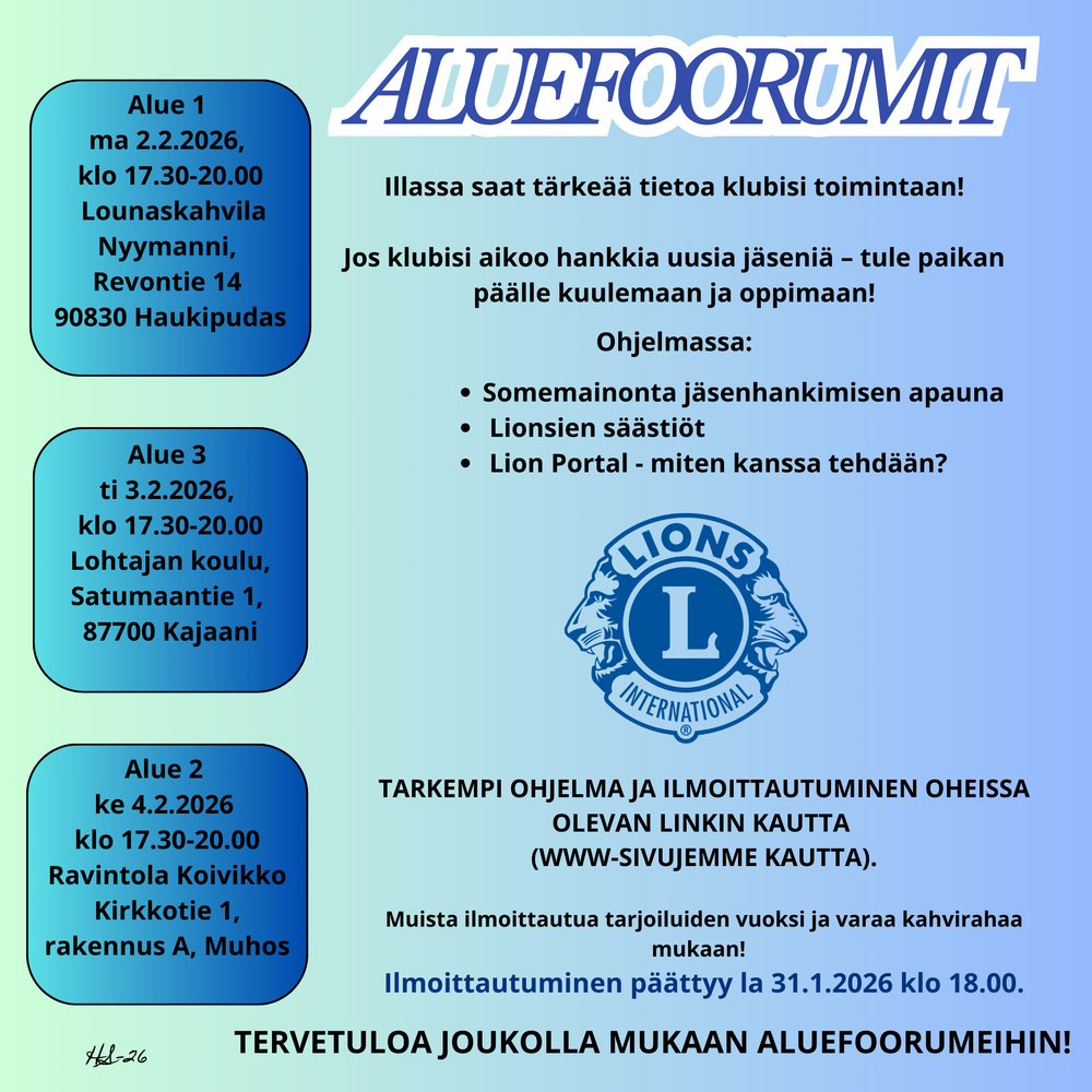 KAIKKI OVAT TERVETULLEITA ALUEFOORUMEIHIN Illassa saat tärkeää tietoa klubisi toimintaan! Muista ilmoittautua tarjoiluiden vuoksi ja varaa kahvirahaa mukaan! Ilmoittautuminen päättyy la 31.1.2026 klo…