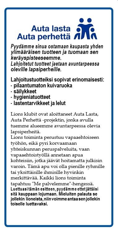 Auta lasta – auta perhettä aktiviteetti, joka on palvelu- ja avustusaktiviteetti
