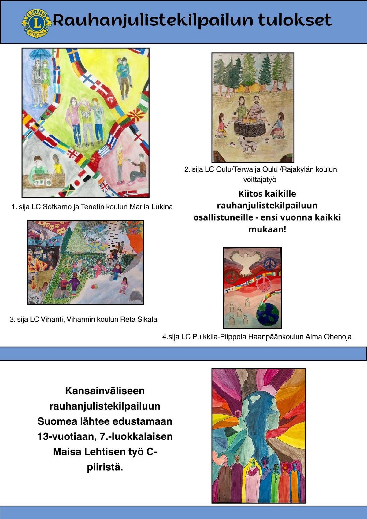 Kansainvälisen lionsklubien järjestön rauhanjulistekilpailu järjestetään 37. kerran. Rauhanjulistekilpailuun osallistuu yli 350 000 rauhanjulistetyötä ja kilpailuun osallistuu lapsia 75 eri maasta. Kansainvälinen lionsklubien järjestö sponsoroi kilpailua korostaakseen maailmanrauhan merkitystä maailman kaikille nuorille. Sotkamossa rauhanjulistekisa on järjestetty 22. kertaa. Lions Club Sotkamon sponsoroima Jonna Määtän Rauhanjuliste pääsi vuonna 2014 maailman laajuisesti 23 kunniamaininnan saaneen joukkoon, joka Suomen paras saavutus Rauhanjulistekisassa. Rauhanjulistekisan järjestäminen on tuonut LC Sotkamolle myönteistä julkisuutta, ja yhteistyö on jatkunut Tenetin koulun kuvaamataidon opettajien kanssa tiiviinä. Rauhanjulistekisa on Tenetin koulun seitsemännen luokan oppilaiden kuvaamataidon kurssina.